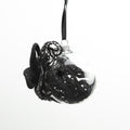 This is a beautiful one of a kind glass ball ornament with a bow made from an applique, Italian metallic lace trim, Swarovski crystals, and a braided trim inside the glass ball.