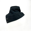 This black lace snap cowl is designed as a statement layer, where delicate texture meets graphic contrast. Intricate lace is anchored by the horizontal stripe detailing, creating a balance of romanticism and edge. Adjustable snaps allow for versatile styling, from a close, structured fit to a more relaxed drape. A considered piece that adds depth and quiet drama to any outfit.