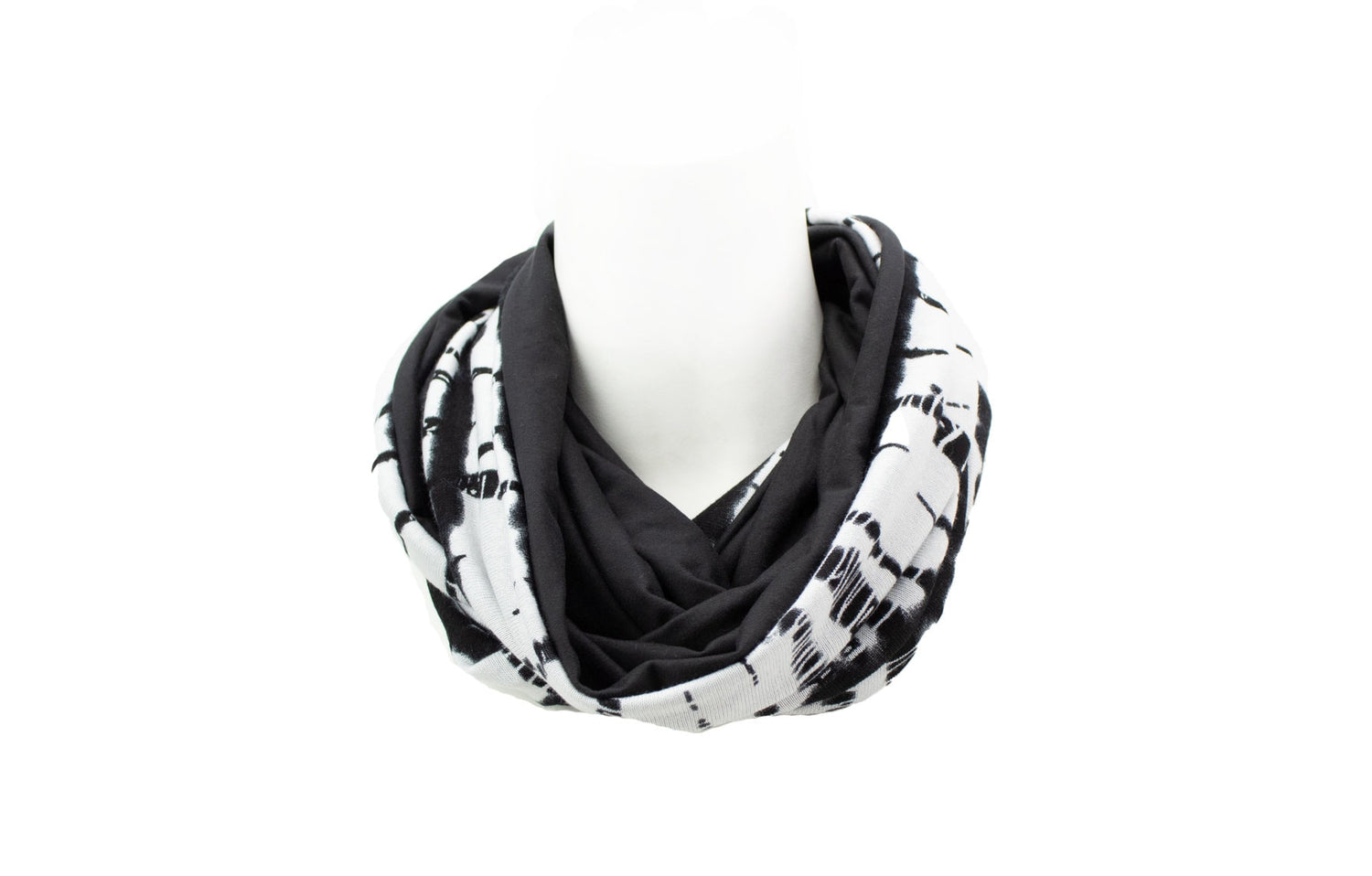 ブラックとオフホワイトのタイダイセーターニットインフィニティスカーフ