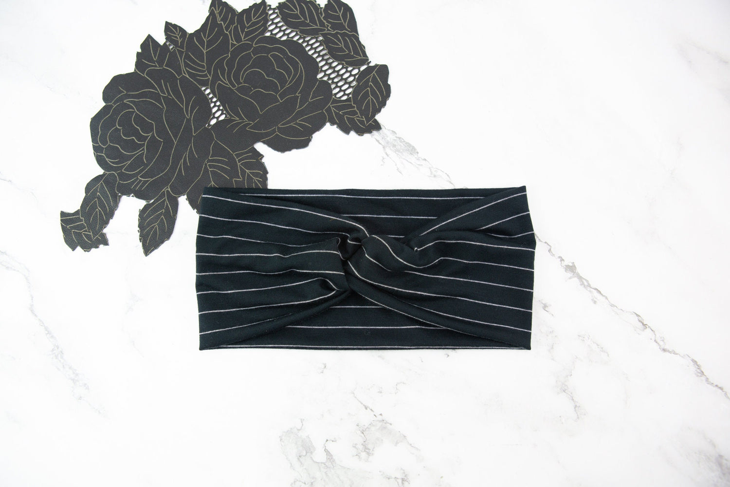 ブラック&ホワイトのピンストライプニットジャージーヘッドバンド