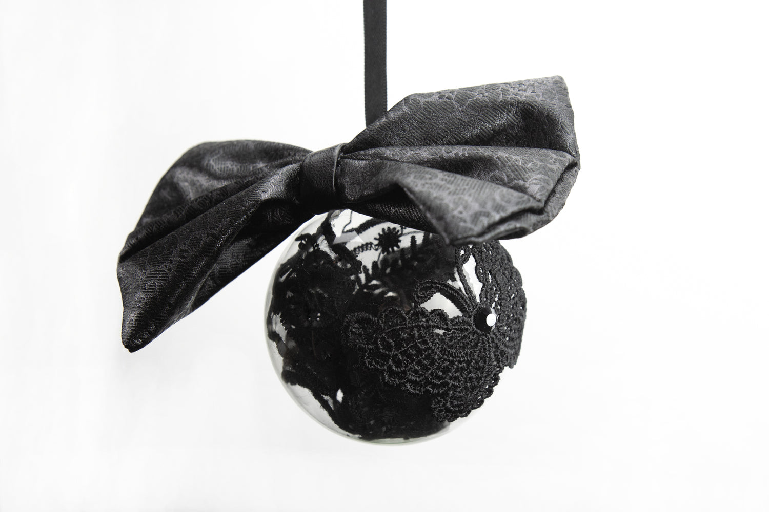 これは、イタリアの錦織り生地で作られたリボン、本革のトリム、蝶のレースのアップリケ、スワロフスキークリスタル、ガラス玉の内側のスパンコールのレースのトリムが付いた、他にはない美しいガラス玉のオーナメントです。