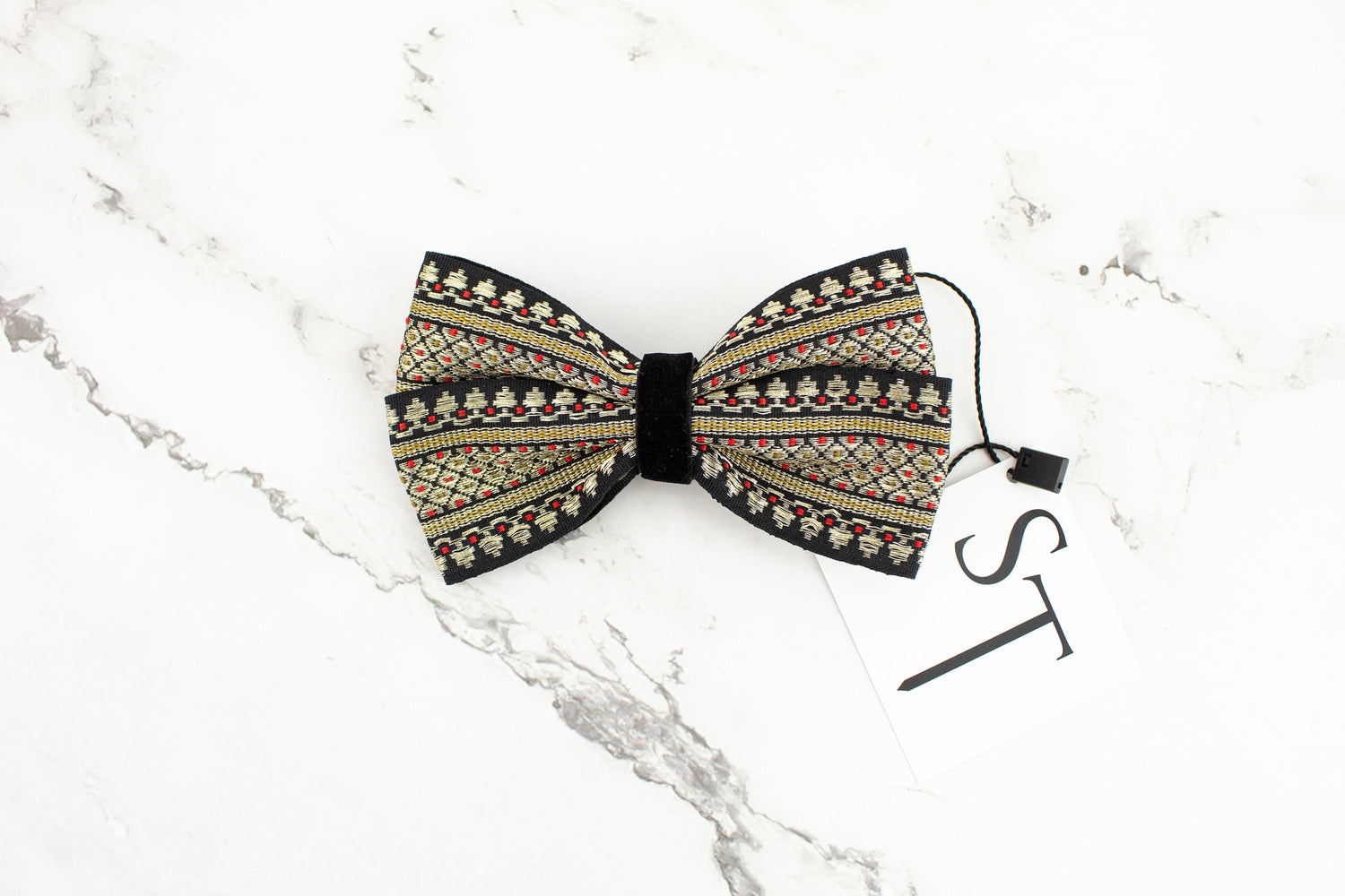 ブラックゴールドとレッドブロケードの蝶ネクタイクリップヘアボウクリップ