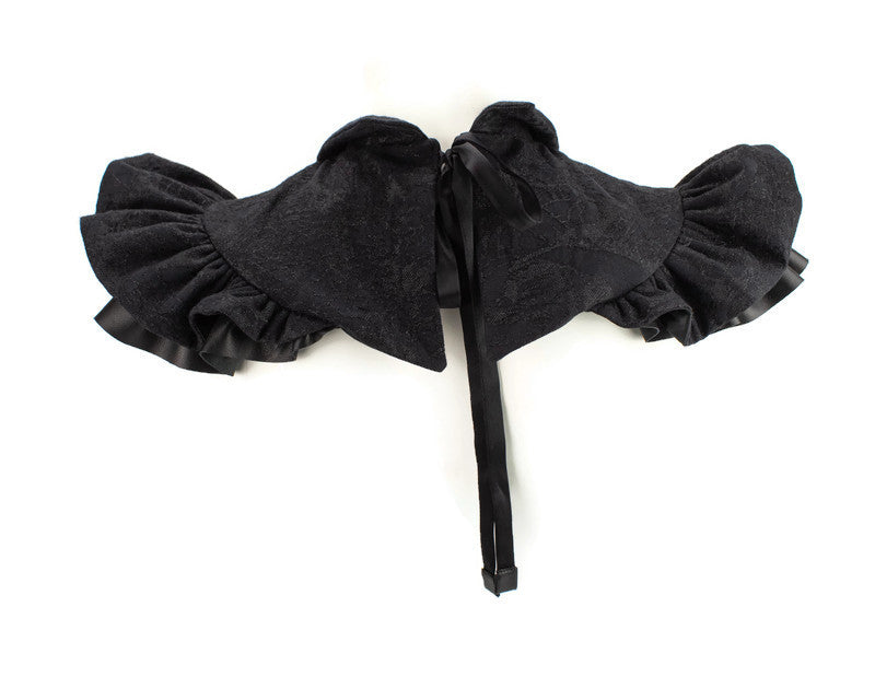ヴィクトリア朝時代のケープレットにインスピレーションを得た、ドラマチックでスタイリッシュなネックカラー。独特のメタリックウールダマスクと本革ラムスキンを使用しています。中央の背面には、調節可能なシルクタイが付いています。