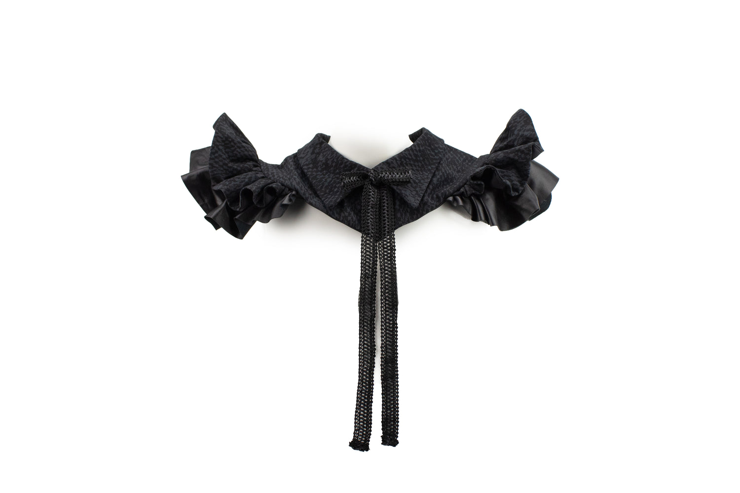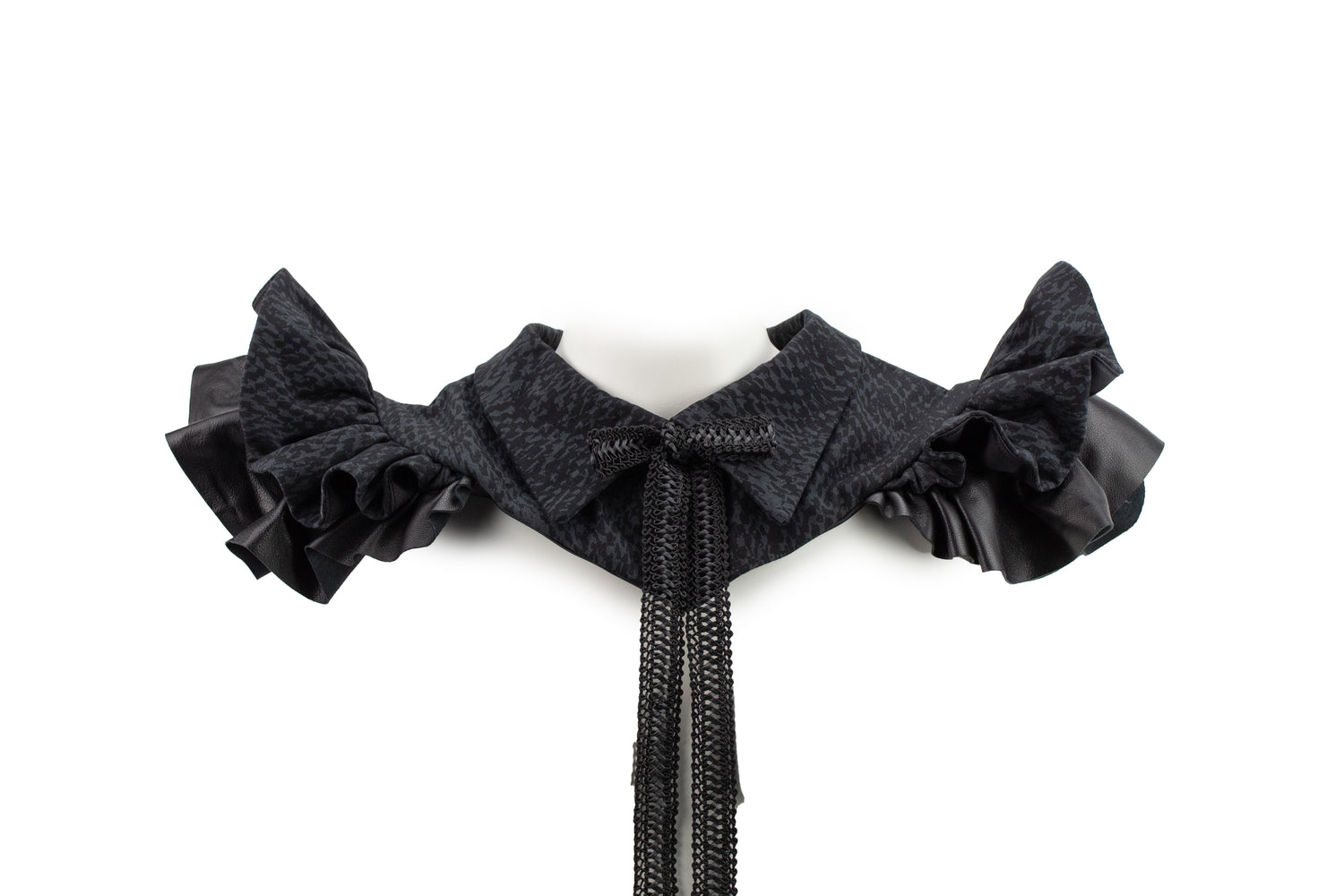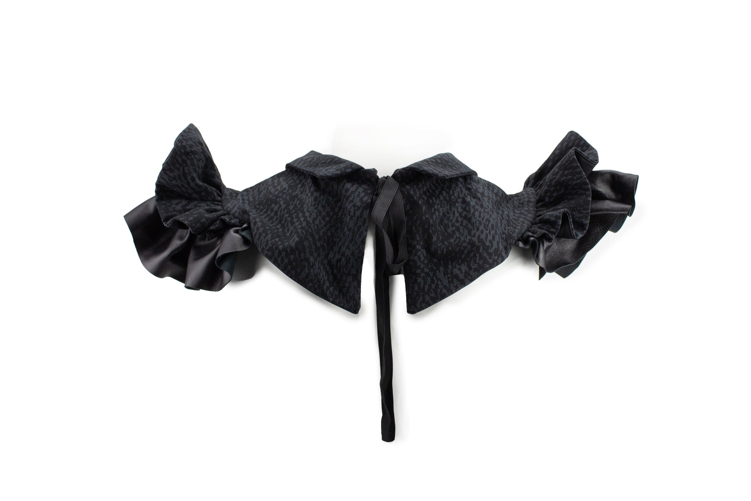 ヴィクトリア朝時代のケープレットにインスピレーションを得た、ドラマチックでスタイリッシュなネックカラー。コットンツイルにユニークなスネークスキンプリントと本革ラムスキンを使用。背面中央に調節可能なタイが付いています。