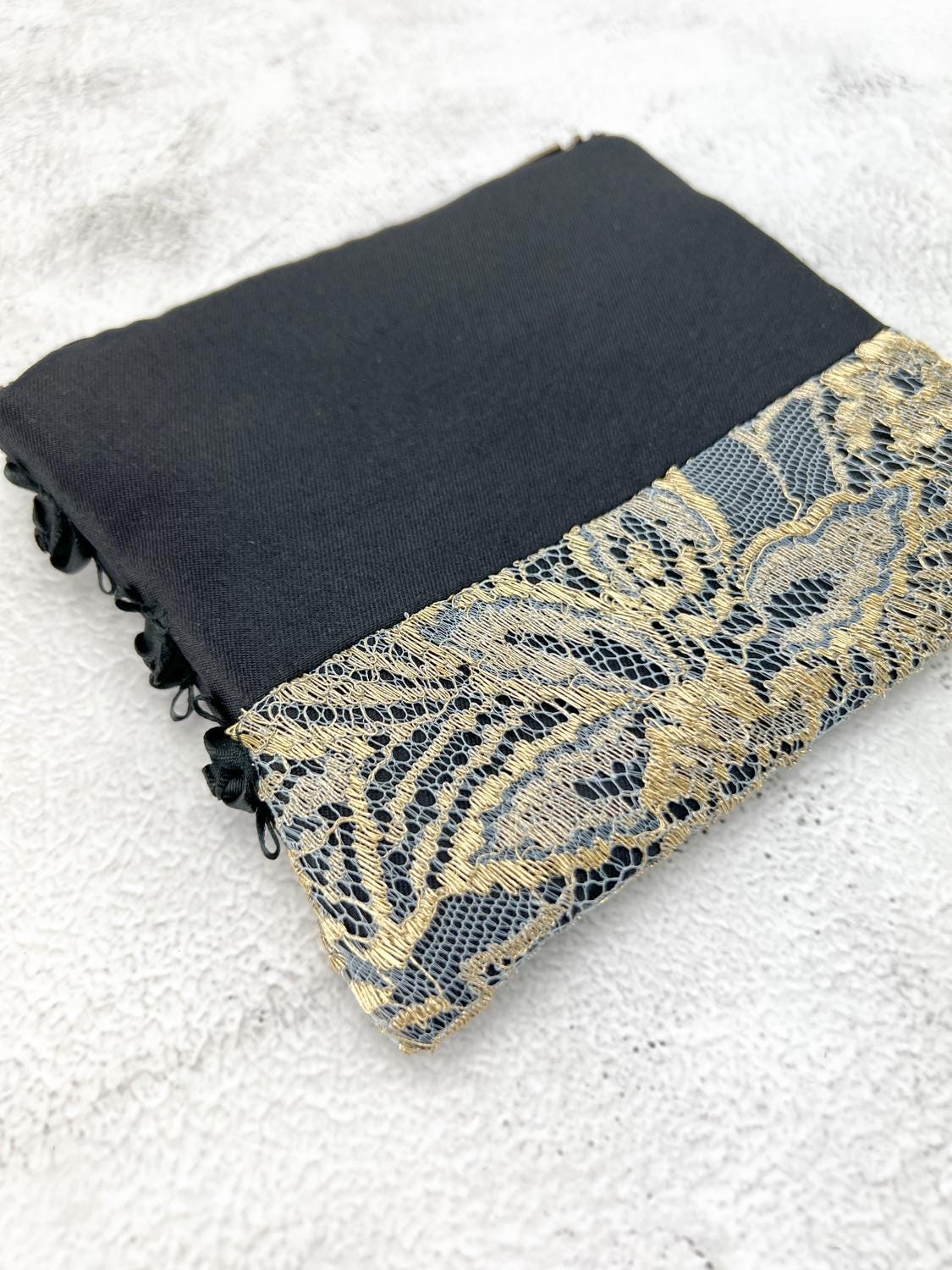 ブラックとメタリックゴールドのレースパネルジッパーポーチ