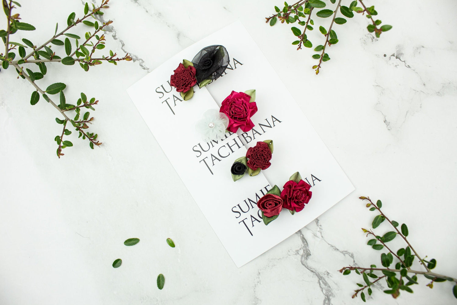 ミニフローラルヘアクリップ 4個セット 赤と黒