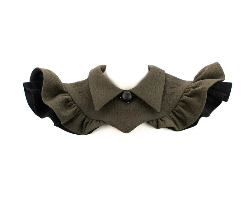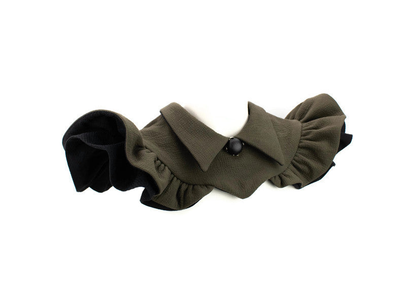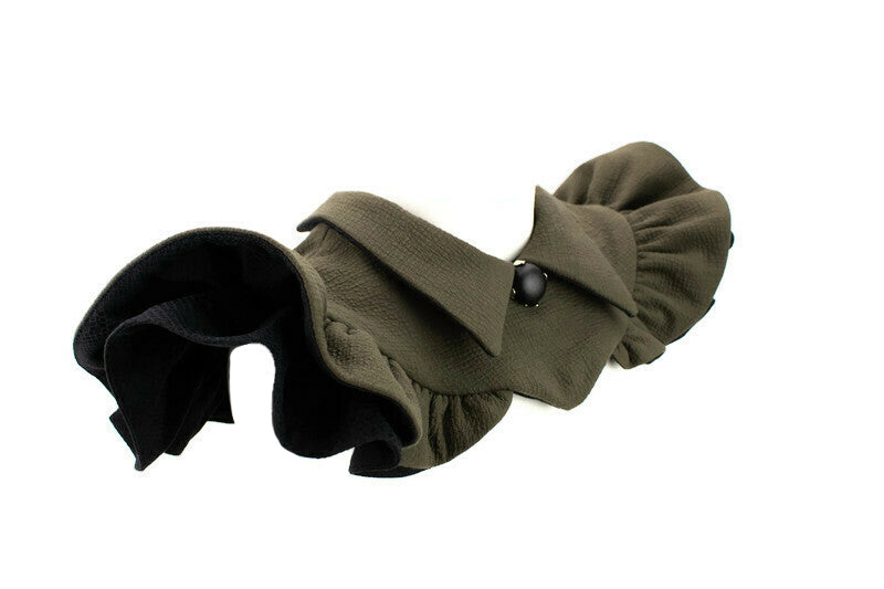 ヴィクトリア朝時代のケープレットにインスパイアされた、ドラマチックでスタイリッシュなネックカラーです。ウール、シルクオーガンザ、本革ラムスキンにユニークなスネークスキンプリントを施し、華やかな印象に仕上げました。背面中央には、調節可能なシルクタイが付いています。
