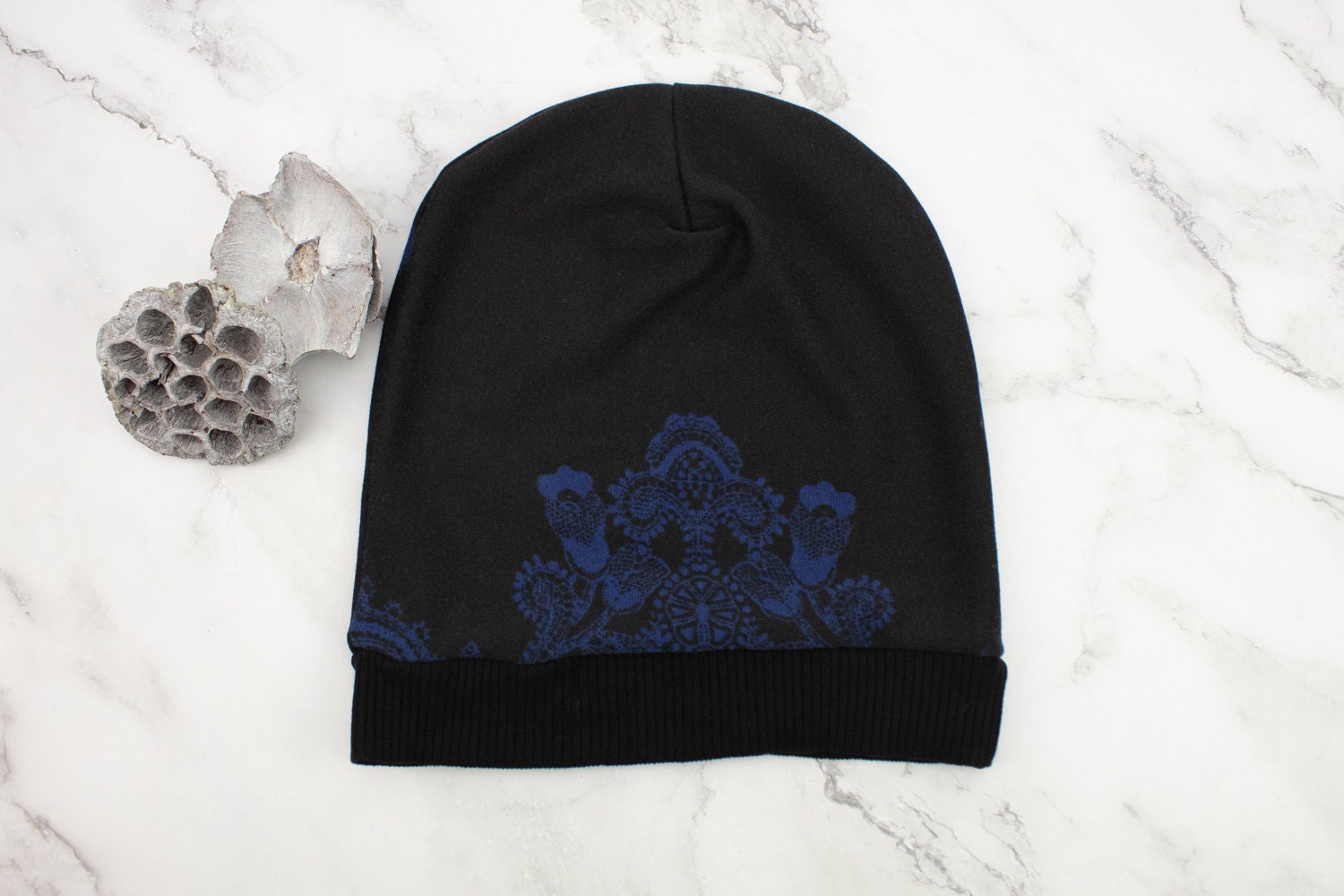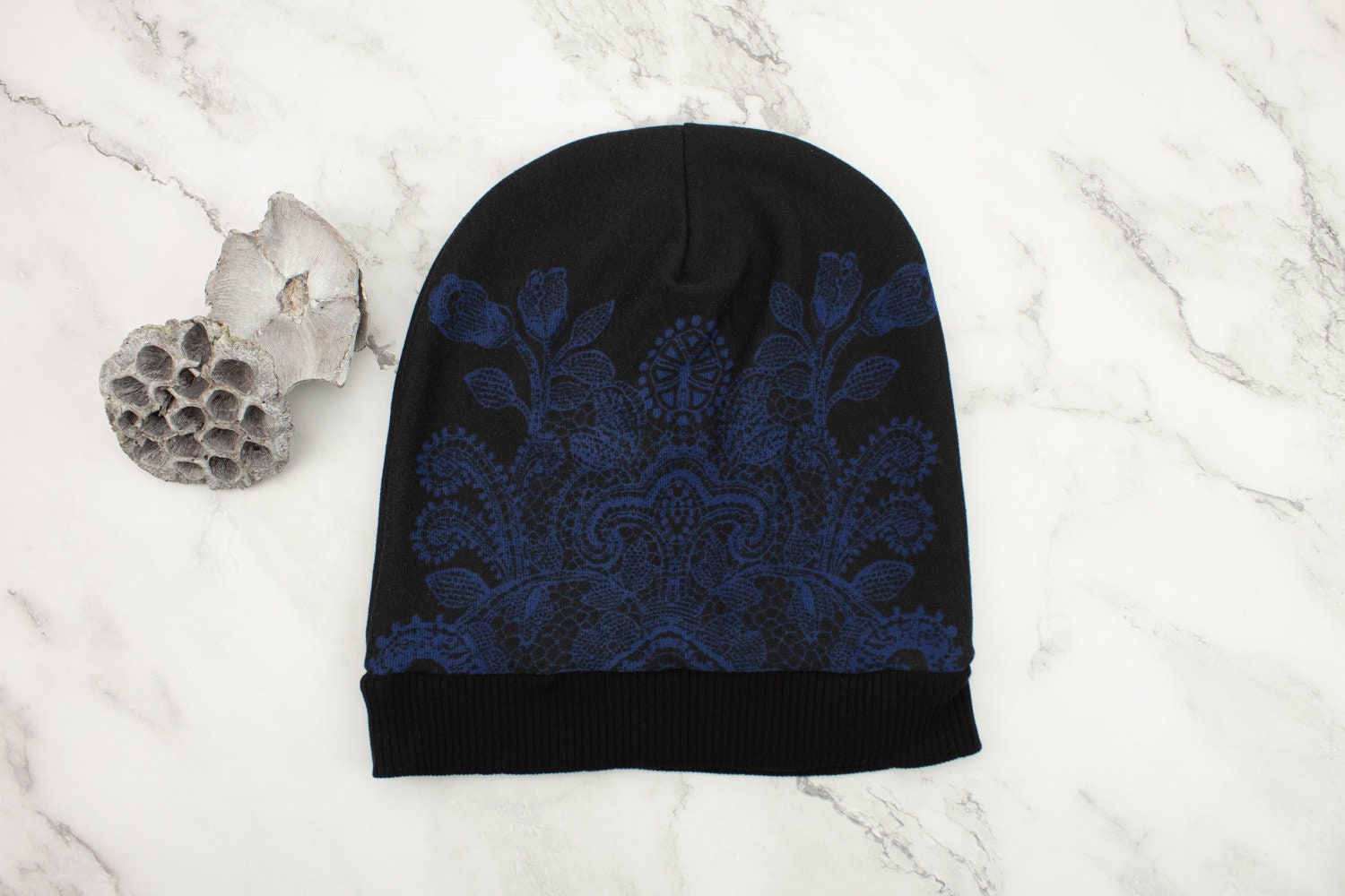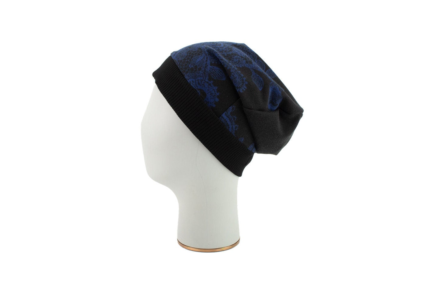 Blue and Black Asymmetrical II Lace Print Slouchy Beanie