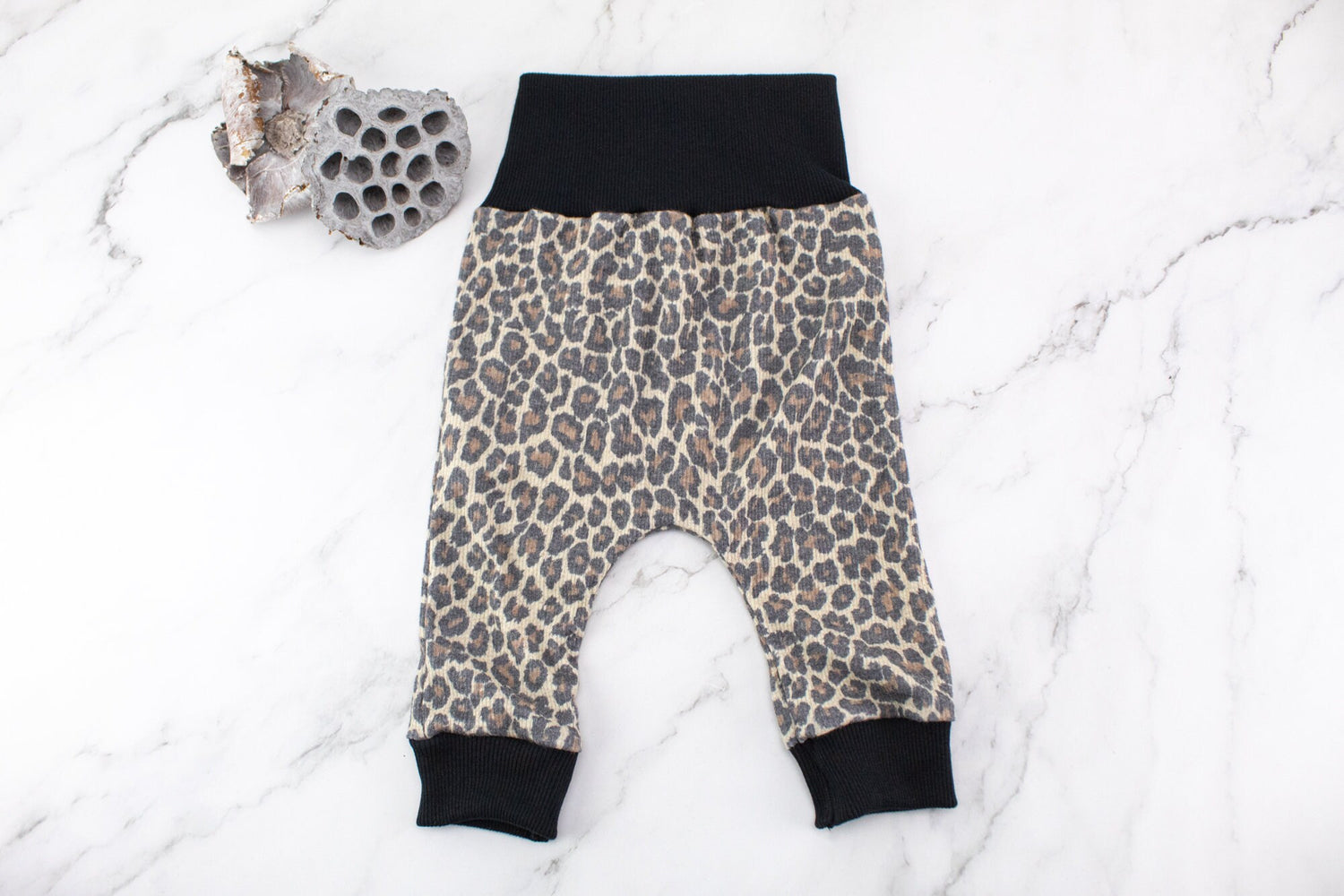 Brown Leopard Print Rib Knit Harem Pants with Wide Black Band 3-6 months or 12-18 months