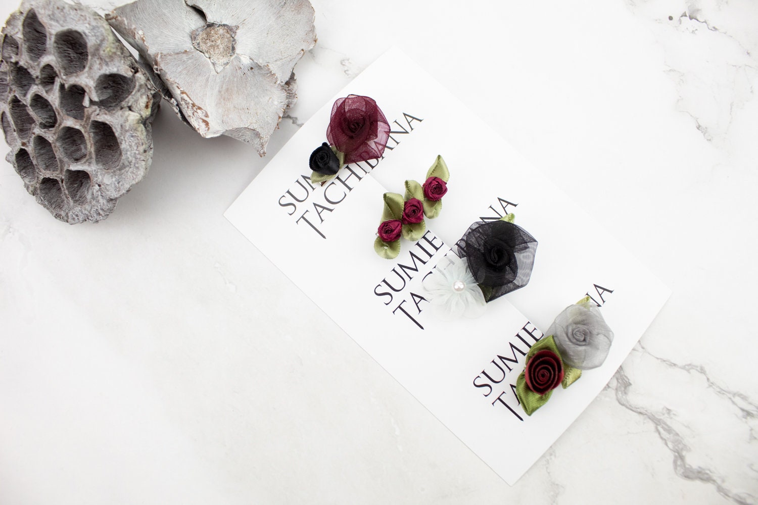 Mini Floral Hair Clip Set of 4 maroon black white silver